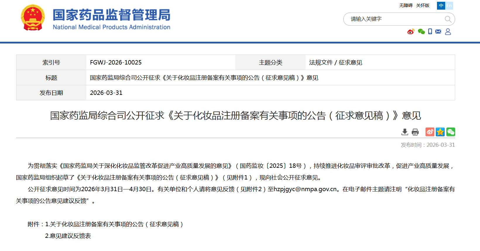 公开征求意见时间为2026年3月31日—4月30日。有关单位和个人请将意见反馈(见附件2)至hzpjgyc@nmpa.gov.cn。在电子邮件主题请注明“化妆品注册备案有关事项的公告意见建议反馈”。